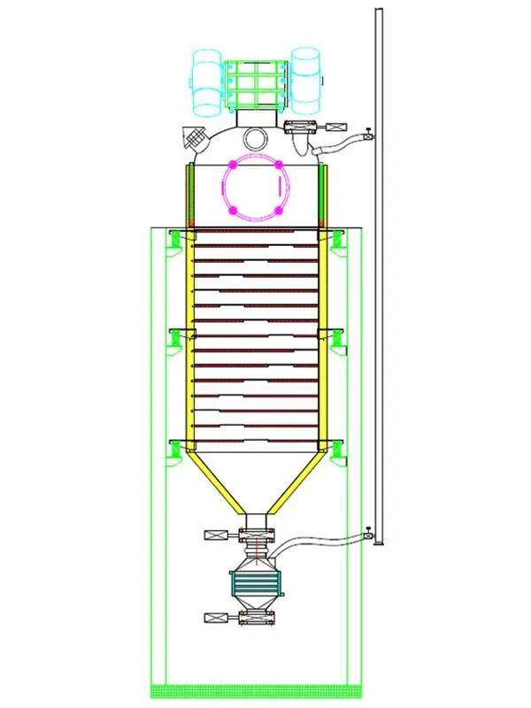 El secador cilíndrico al vacío tiene una función adicional: los materiales líquidos se pulverizan dentro del sistema de secado al vacío a alta presión, de modo que el agua se evapora rápidamente. Una vez seco, el polvo viscoso se transporta a lo largo del espiral por la vibración y, finalmente, se descarga por la tolva de vacío inferior.
